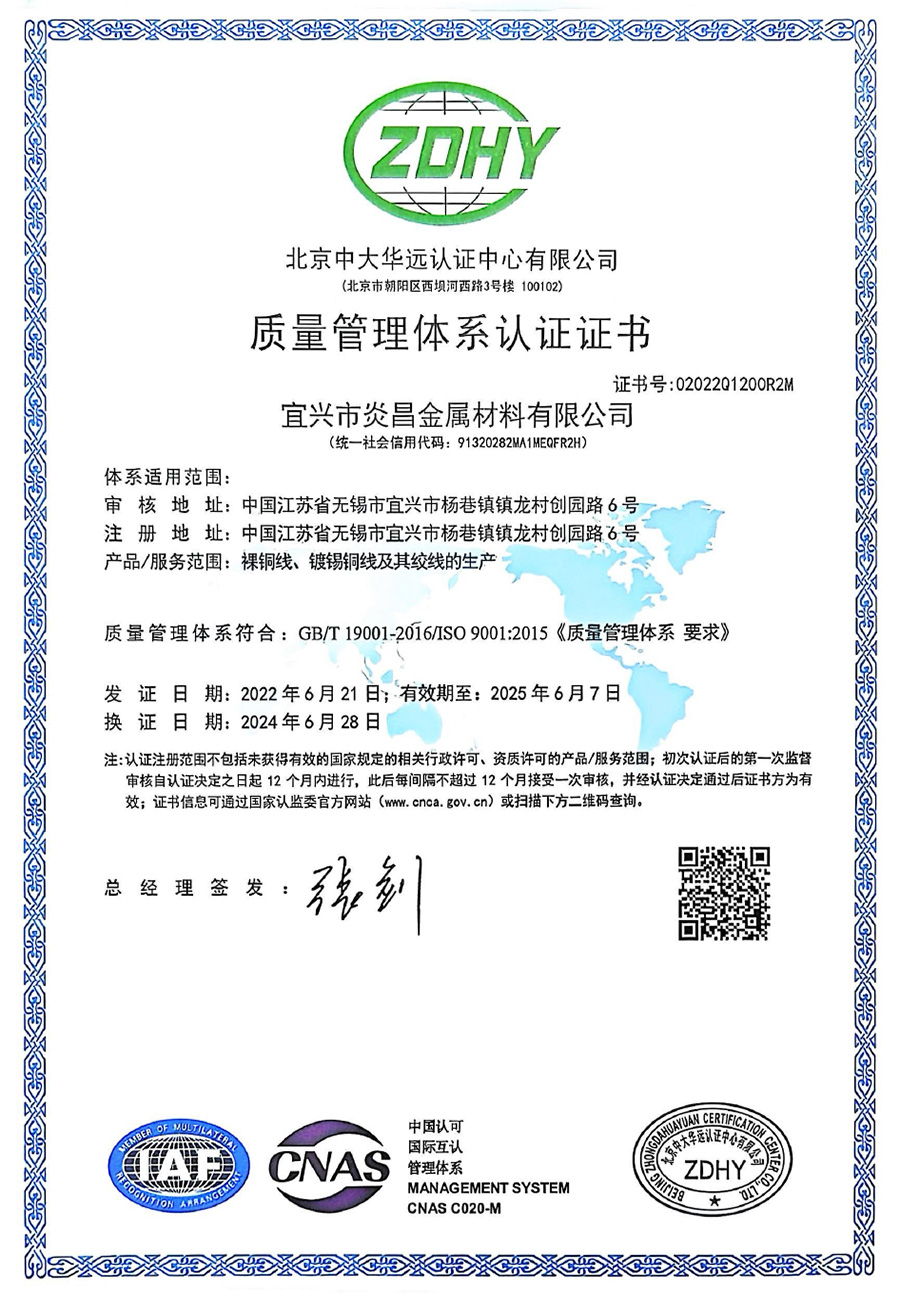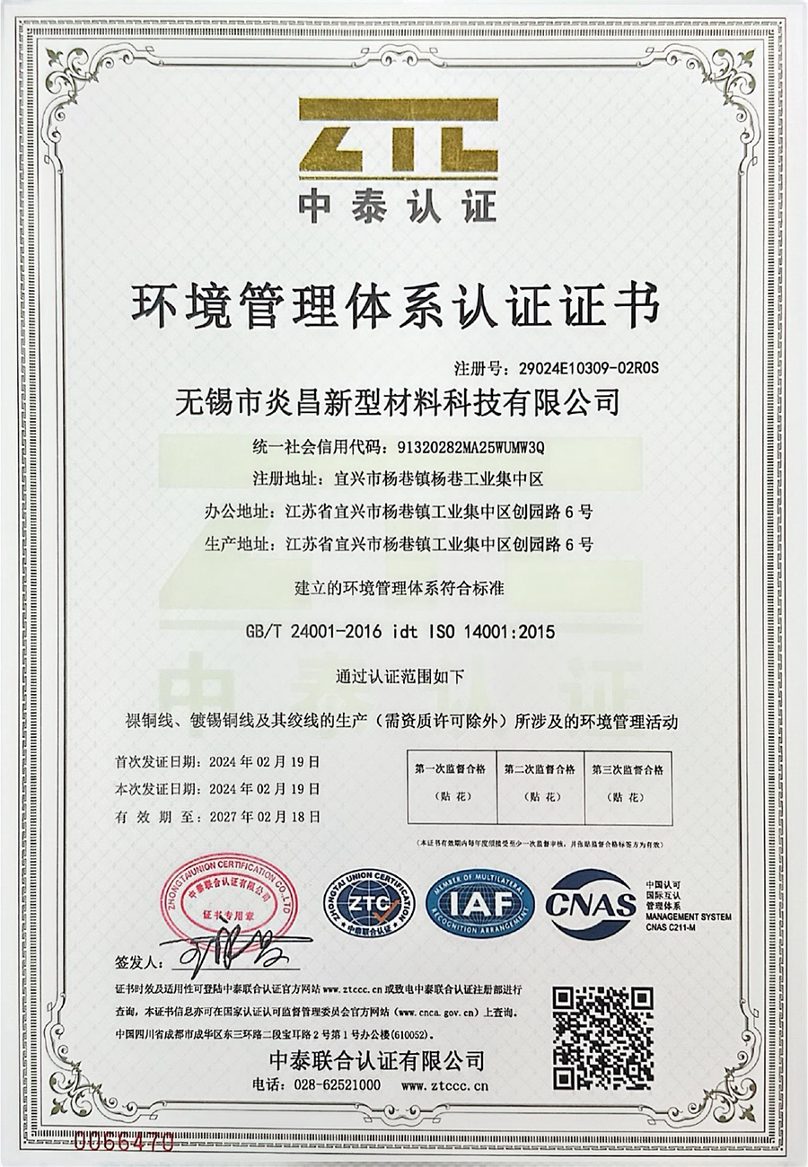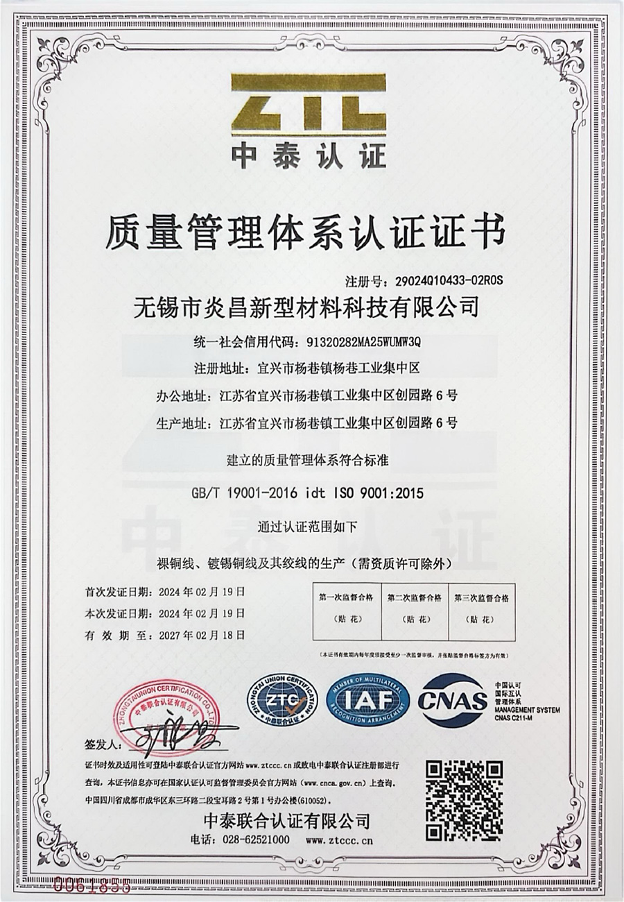 無錫市炎昌新型材料科技有限公司,是在原宜興市炎昌金屬材料有限公司的基礎上發展成立的,宜興炎昌成立于 2015 年,是一家專業從事銅導體材料研發、制造、銷售于一體的新型公司,是產品體系較為完整的銅絲加工生產企業。